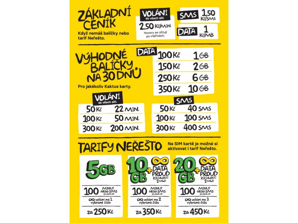 Základní ceník Kaktus: 100 Kč kredit + 500 MB + 500MB MB = 1 GB od 1.7 již neplatí data na sociální sítě, ale na kartě je rovnou 1 GB dat (dle nařízení EU se datové balíčky...