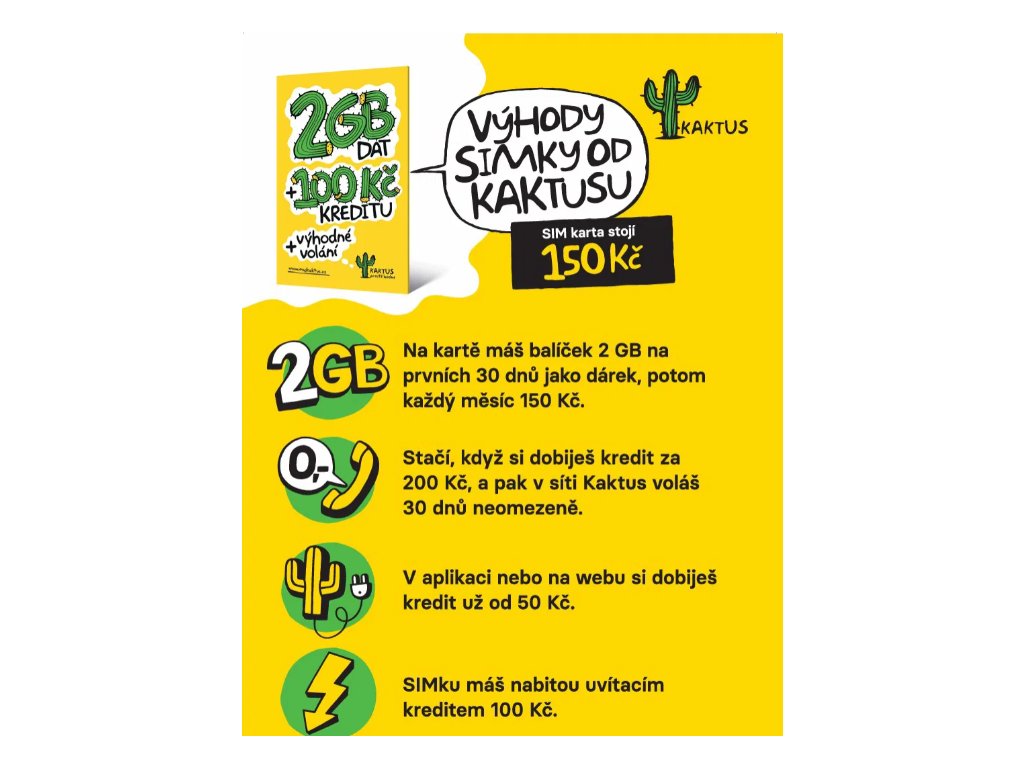 SIM karta KAKTUS 100 Kč + 2 GB + 50+1 ZDARMA!